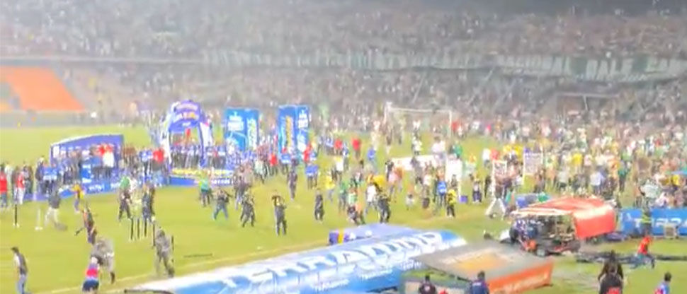 Los barras bravas de Atlético Nacional y del DIM se enfrentaron en el campo de juego destrozando toda la utilería que serviría para ambientar la celebración.