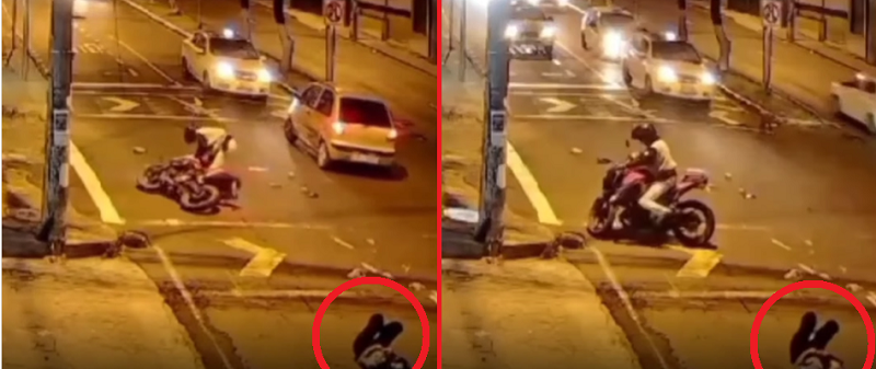 En las imágenes se observa que, luego de colisionar con otro vehículo, el hombre se levanta y se enfoca de inmediato en revisar su motocicleta, aparentemente más preocupado por los daños materiales que por la salud de su acompañante, quien yacía herida sobre la calle.