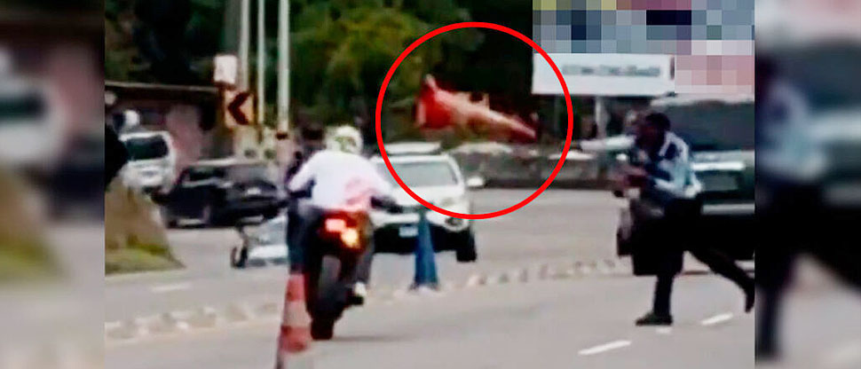Sin embargo, al notar la maniobra evasiva, el agente tomó uno de los conos de tránsito de color naranja y lo arrojó directamente hacia la espalda del motociclista.