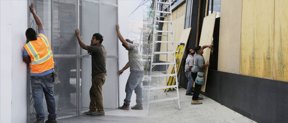 Láminas metálicas, Ventanales cubiertos con madera y protecciones improvisadas forman parte del panorama actual en zonas comerciales.