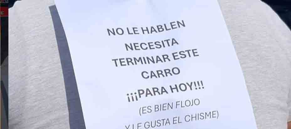 «No le hablen necesita terminar este carro ¡¡¡para hoy!!! (es bien flojo y le gusta el chisme» fue el cartel que le pegaron sus compañeros en la espalda.