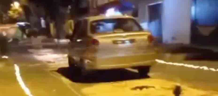 En las imágenes se observa cuando el conductor transita con su automóvil sobre la alfombra y los adornos procesionales que se encontraban en la calle.