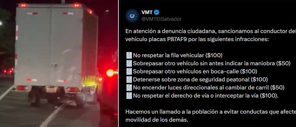 El conductor fue sancionado por: No respetar la fila vehicular ($100); Sobrepasar otro vehículo sin antes indicar la maniobra ($50); sobrepasar otro vehículos en boca-calle ($100); detenerse sobre zona de seguridad peatonal ($100); no encender luces direccionales al cambiar de carril ($50); no respetar el derecho de vía o interceptar la vía ($100).