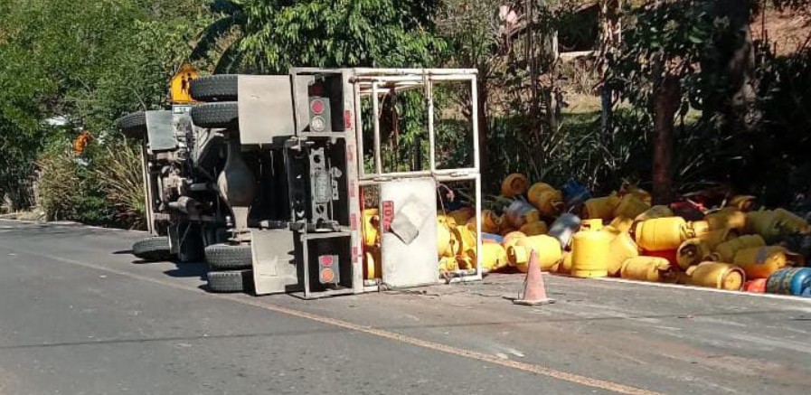 Un camión que transportaba tambos de gas se encuentra volcado sobre la carretera que conduce hacia Chalatenango, específicamente en el tramo bajando a El Zapote, en el distrito de Nueva Trinidad.