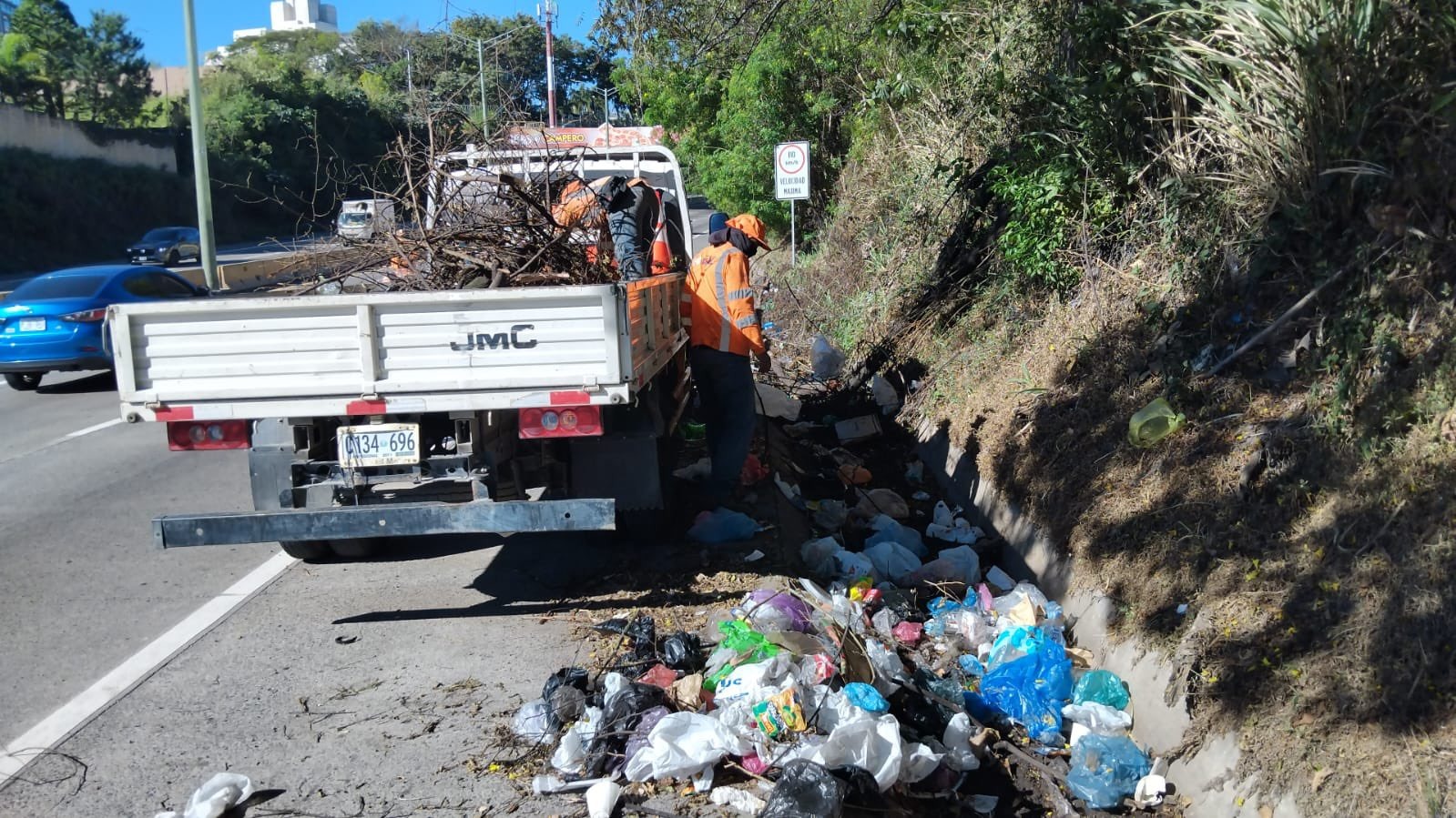 También, los equipos del FOVIAL se trasladaron hasta el Periférico Claudia Lars, en La Libertad, para realizar trabajos de limpieza de cunetas y obras de mantenimiento como poda de las zonas verdes.