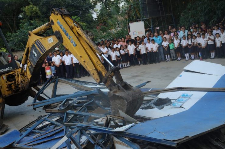Los trabajos iniciaron con demoliciones de la infraestructura existente, donde posteriormente se construirán tres módulos de aulas; dos de estos a dos niveles; áreas recreativas independientes, enfermería, administración y salón de usos múltiples.