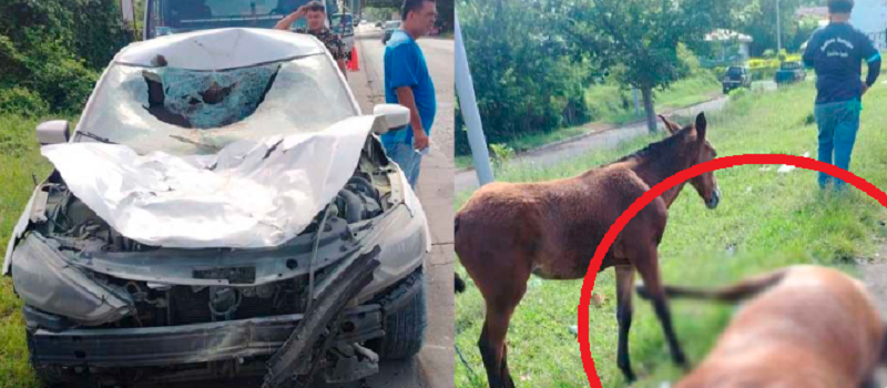 Según informes preliminares, el percance ocurrió cuando el animal se cruzó repentinamente frente al automóvil, provocando un fuerte choque que dejó daños materiales considerables. La yegua murió en el lugar debido a la gravedad del impacto.