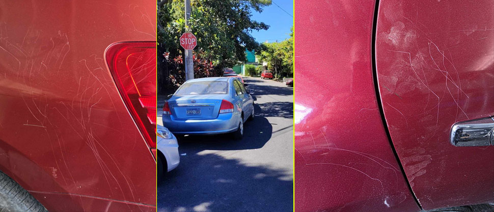 Un ciudadano mostró su descontento al encontrar su vehículo rayado de la pintura, luego de haberlo dejado estacionado por unos momentos a la orilla de la calle Bernal Bis, colonia San Luis, San Salvador.Eventos en El Salvador
