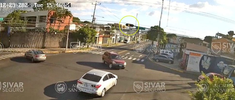 Las cámaras de videovigilancia municipal del sistema Sivar Seguro captaron el choque entre dos vehículos, en la intersección de la avenida Bernal y calle Constitución, en San Salvador.