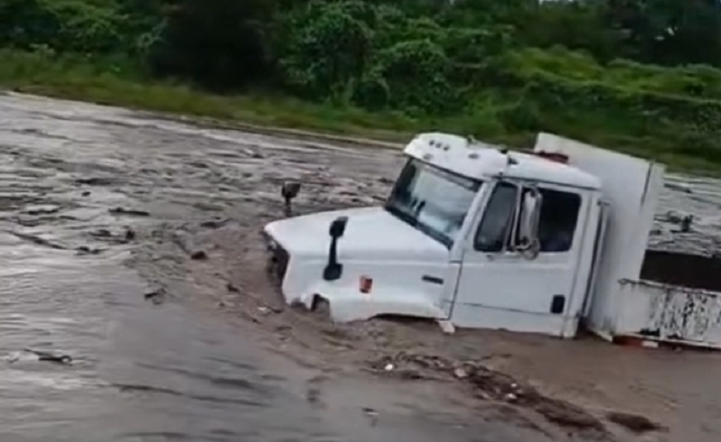 En un video difundido en redes sociales se observa cómo un vehículo pesado quedó completamente cubierto por el agua.