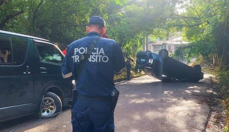 La Policía Nacional Civil (PNC) reportó un accidente de tránsito ocurrido en la calle El Chaparral, que conduce hacia la colonia La Esperanza, en el distrito de Colón, La Libertad Oeste. En el percance se vieron involucrados un microbús y un vehículo particular que terminó volcado.