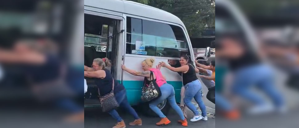 #ElSalvador l Un grupo de mujeres se ha hecho viral luego de ser captadas empujando a un microbús del transporte colectivo, que quedó varado por desperfectos mecánicos. pic.twitter.com/efCcWmSAod