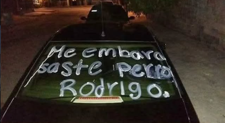 De acuerdo con las imágenes difundidas, el automóvil, de color negro, amaneció con mensajes escritos en el parabrisas y una de las puertas, en los que una mujer acusa al propietario de haberla dejado embarazada.