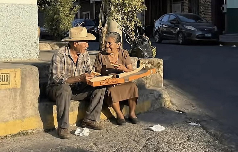 Entre flores, globos y cenas elaboradas que marcaron la celebración del 14 de febrero, una imagen sencilla se abrió paso como una de las postales más emotivas de la jornada. En ella, una pareja de esposos de avanzada edad comparte una pizza sentados en la acera, ajenos al bullicio y concentrados únicamente en su mutua compañía.