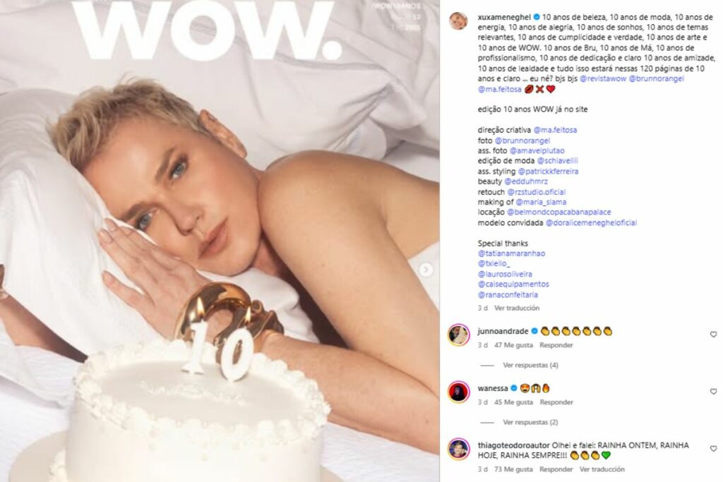 Décadas después, Xuxa vuelve a ser noticia. A sus 62 años, posó en topless para celebrar el décimo aniversario de la revista WOW, una publicación con sede en Miami dedicada al entretenimiento y la cultura pop latina.