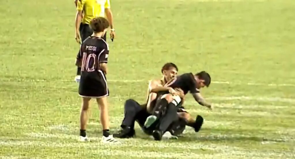 Uno de los intrusos logró llegar hasta Messi y lo abrazó por la cintura, momento en el que el personal de seguridad intervino con rapidez. En el forcejeo para retirar al hincha, tanto Messi como el aficionado y un guardia de seguridad cayeron al suelo, pero el delantero argentino se mantuvo estoico y se levantó de inmediato, sin lesiones aparentes.